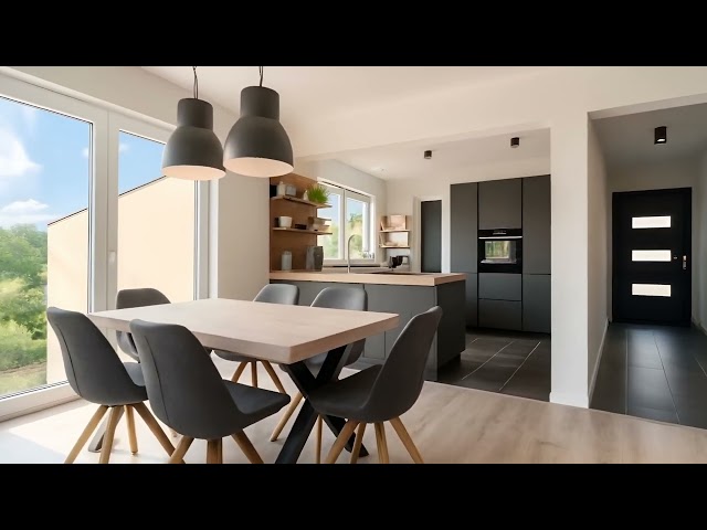 Bereits beim Betreten des Hauses eröffnet sich ein repräsentativer Eingangsbereich, der fließend in den offen gestalteten Wohn- und Essbereich übergeht. Großzügige Fensterflächen durchfluten die Räume mit Tageslicht und schaffen eine beeindruckende Verbindung zwischen Innen- und Außenbereich. Die elegant integrierte Küche wird durch eine separate Speisekammer ergänzt und unterstreicht den hochwertigen, durchdachten Charakter des Hauses.